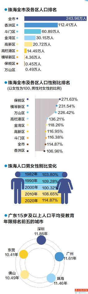 第七次全国人口普查还显示,过去10年,珠海男女性别比持续升高,全市常住人口中,男性人口130余万人,占53.46%;女性人口113万余人,占46.54%,总人口性别比由2010年第六次全国人口普查的108.65上升为114.87。