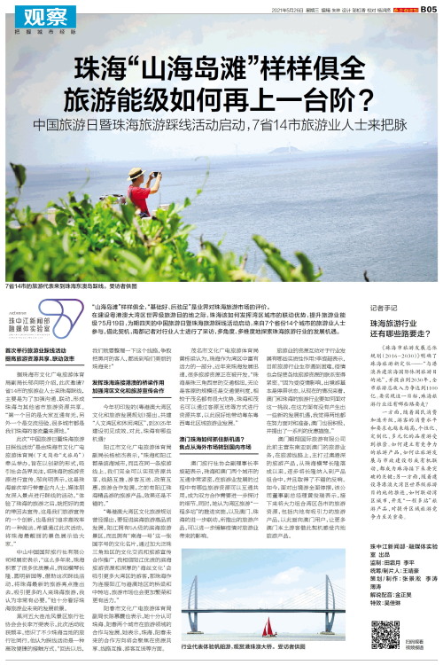 “山海岛滩”样样俱全,“基础好、后劲足”是业界对珠海旅游市场的评价。在建设粤港澳大湾区世界级旅游目的地之际,珠海该如何发挥湾区城市的联动优势,提升旅游业能级?5月19日,为期四天的中国旅游日暨珠海