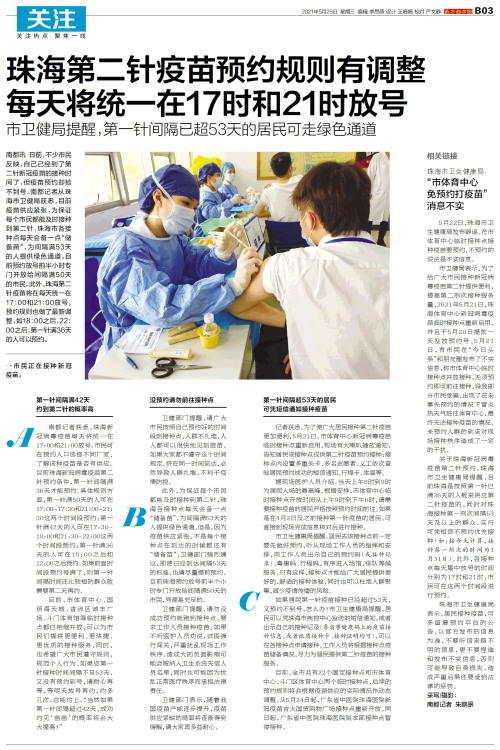 珠海第二针疫苗预约规则有调整 每天将统一在17时和21时放号