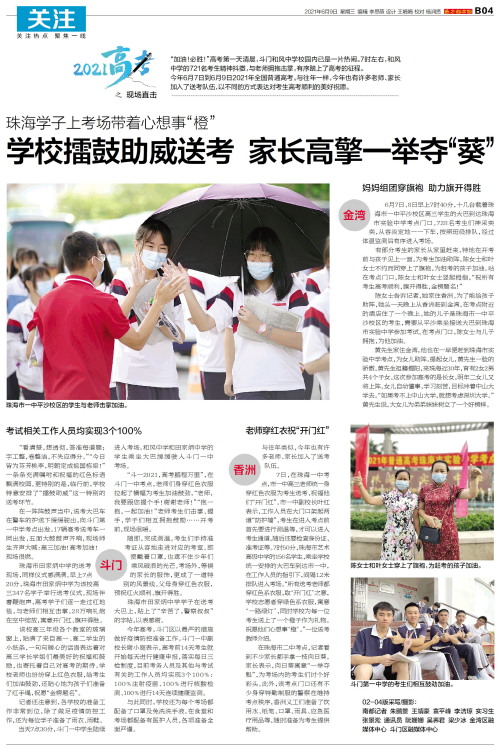 7日,在珠海一中考点,市一中高三老师统一身穿红色衣服为考生送考,祝福他们“开门红”。市一中副校长叶红表示,工作人员在大门口架起两道“防护墙”,考生在进入考点前首先要进行测温等,才可以进入考生通道,随后还要检查身份证、准考证等。7时50分,珠海市艺术高级中学的156名学生,乘坐学校统一安排的大巴车到达市一中,在工作人员的指引下,间隔1.2米排队进入考场。“所有送考老师都穿红色系衣服,取‘开门红’之意,学校志愿者穿绿色系衣服,寓意‘一路绿灯’,同时学校为每一位考生送上了一个橙子作为礼物,祝愿他们心想事‘橙’。”一位送考教师介绍。