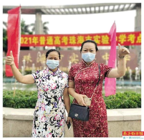 有部分考生的家长从家里赶来,特地在开考前与孩子见上一面,为考生加油助阵。陈女士和叶女士不约而同穿上了旗袍,为赶考的孩子加油。站在考点门口,陈女士和叶女士竖起拇指,“祝所有考生高考顺利,旗开得胜,金榜题名!”