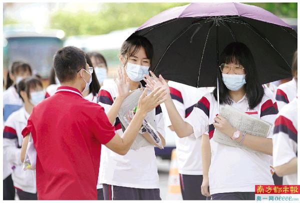 “加油!必胜!”高考第一天清晨,斗门和风中学校园内已是一片热闹。7时左右,和风中学的721名考生精神抖擞,与老师拥抱击掌,有序踏上了高考的征程。