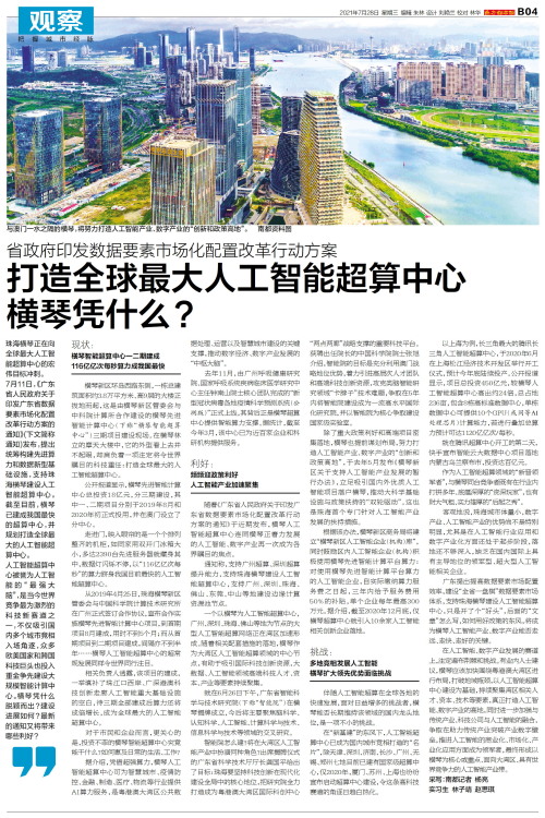 珠海横琴正在向全球最大人工智能超算中心的宏伟目标冲刺。7月11日,《广东省人民政府关于印发广东省数据要素市场化配置改革行动方案的通知》(下文简称通知)发布,提出统筹构建先进算力和数据新型基础设施,
