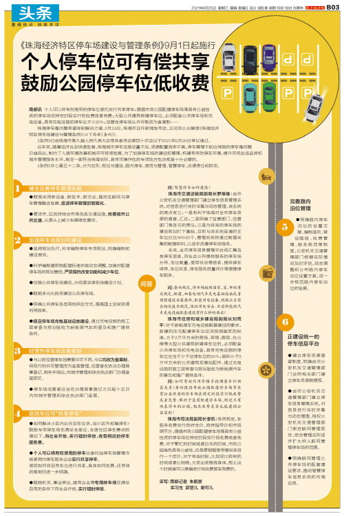 南都讯 个人可以将有权使用的停车位委托实行共享停车;提倡市政公园配建停车场等具有公益性质的停车场在特定时段实行低收费或者免费;大型公共建筑新建停车位,必须配备公共停车场和充电设备,具有充电设施的停