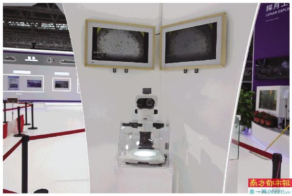 ↑观众用显微镜观察月壤。