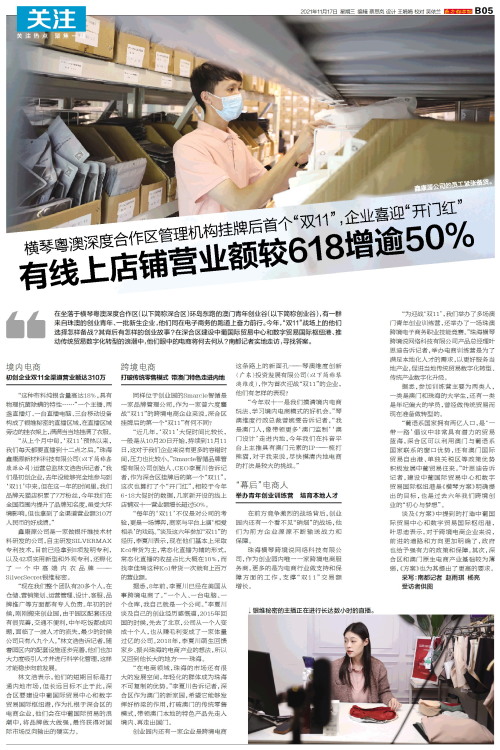 在坐落于横琴粤澳深度合作区(以下简称深合区)环岛东路的澳门青年创业谷(以下简称创业谷),有一群来自珠澳的创业青年、一批新生企业,他们同在电子商务的跑道上奋力前行。今年,“双11”战场上的他们选择怎