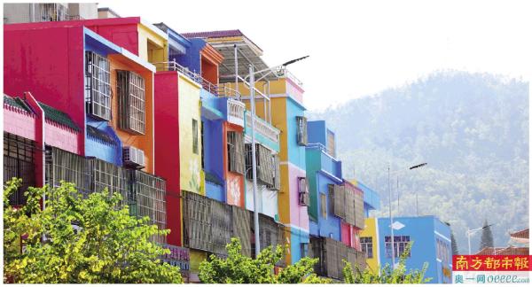 近日,记者步入斗门区乾务镇荔山村村口牌坊,宛如走进了童话世界。一栋栋楼房被涂上缤纷色彩,阳光下五彩斑斓。赤红、明橙、亮黄、葱绿、靛青、深蓝、黛紫、淡粉……进村道路两侧的楼房外立面化身调色盘,为昔日色彩单调的街景披上了“新衣”。