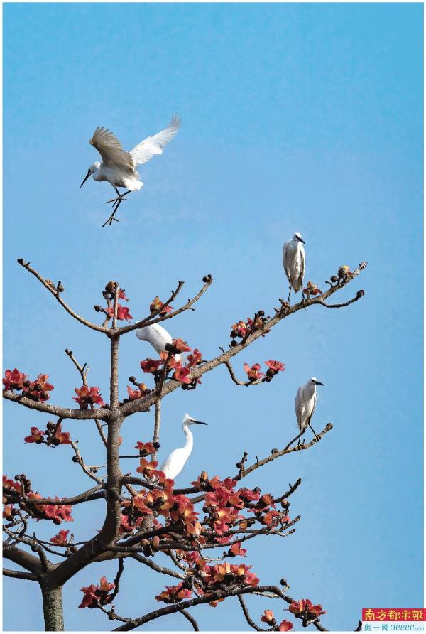 珠海金湾“鹭鸟天下”人工湿地,一棵木棉树成了白鹭嬉戏之地。 南都拍客 马红海 摄