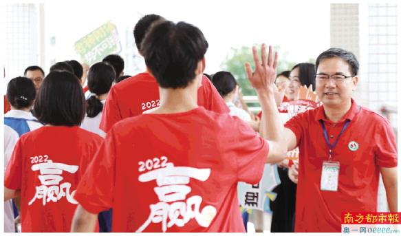 在华南师范大学中山附属中学考点,老师和考生击掌送上祝福。