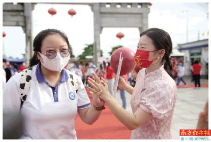 同一考点内,为了给考生们加油鼓劲,东区中学的老师也是创意满满,身着旗袍祝同学们旗开得胜。老师们拿着加油手牌:“逢考必胜”“高考加油鸭”“执守梦想,相伴同行”“旗开得胜,逢考必过”“超常发挥”,祝愿考生们“高考必胜”!