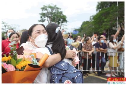 6月9日晩上6点30分左右,在中山市一中初中部考点,考生结束考试走出考场,场外家长拿着鲜花迎接。