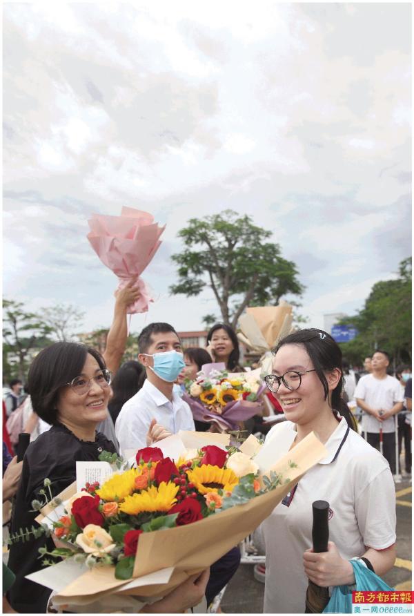 6月9日傍晚,在中山市一中初中部考点,结束考试的考生走出考场,家长拿着鲜花迎接。 南都记者 吴进 实习生 林彦燊 摄