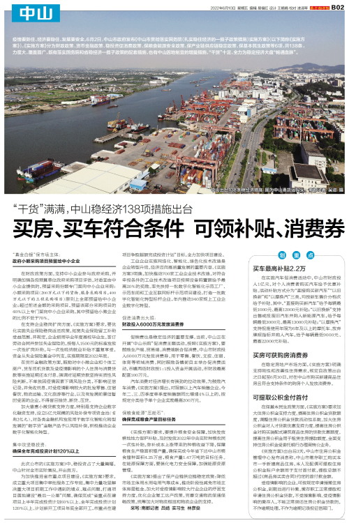 中山出台138条稳经济措施,图为中山港货运码头。 南都记者 吴进 摄 疫情要防住、经济要稳住、发展要安全。6月2日,中山市政府发布《中山市贯彻落实国务院〈扎实稳住经济的
