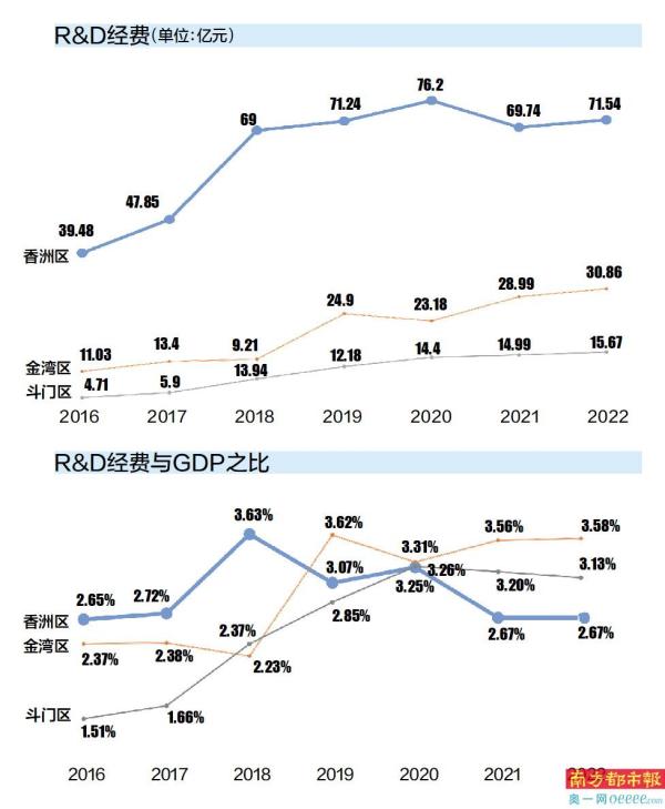 从总量来看,香洲区R&D经费投入总量一直遥遥领先,超过金湾和斗门总数之和。从占比来看,2019年,香洲区GDP占比被金湾超过,排名第二;2020年,香洲区GDP占比被斗门超过,自此形成金湾、斗门、香洲的排名直到2022年。
