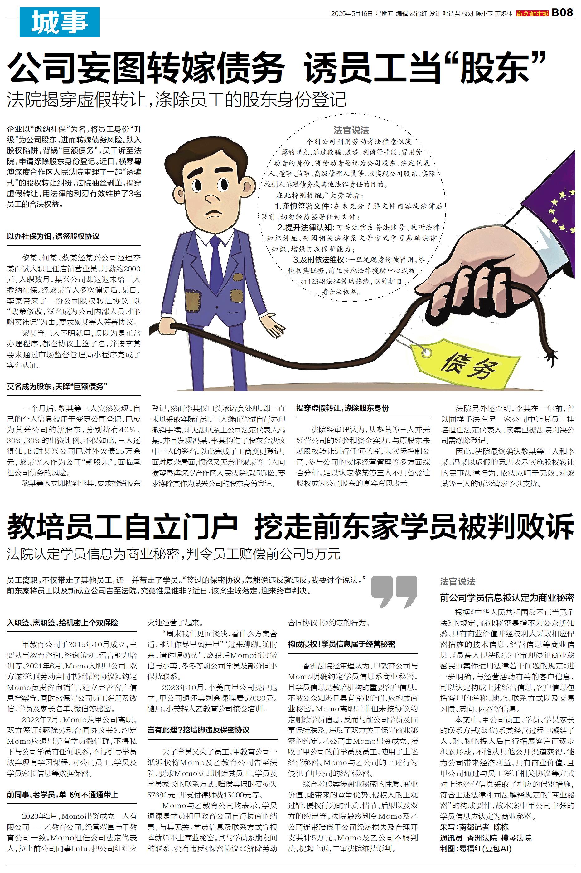企业以“缴纳社保”为名,将员工身份“升级”为公司股东,进而转嫁债务风险。跌入股权陷阱,背锅“巨额债务”,员工诉至法院,申请涤除股东身份登记。近日,横琴粤澳深度合作区人民法院审理了一起“诱骗式”的股