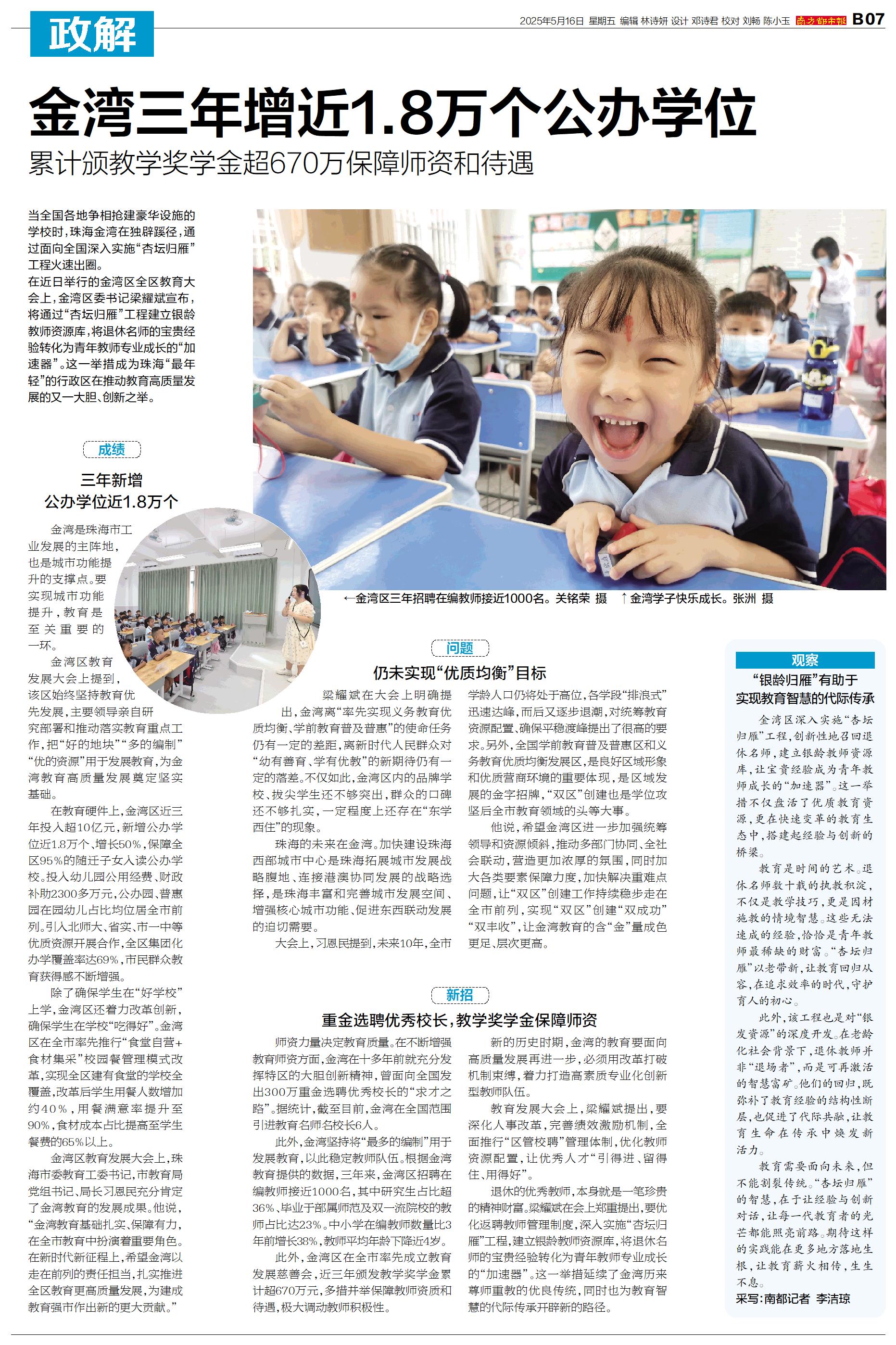 当全国各地争相抢建豪华设施的学校时,珠海金湾在独辟蹊径,通过面向全国深入实施“杏坛归雁”工程火速出圈。 在近日举行的金湾区全区教育大会上,金湾区委书记梁耀斌宣布,将通过“杏坛归雁”工程建立银龄教