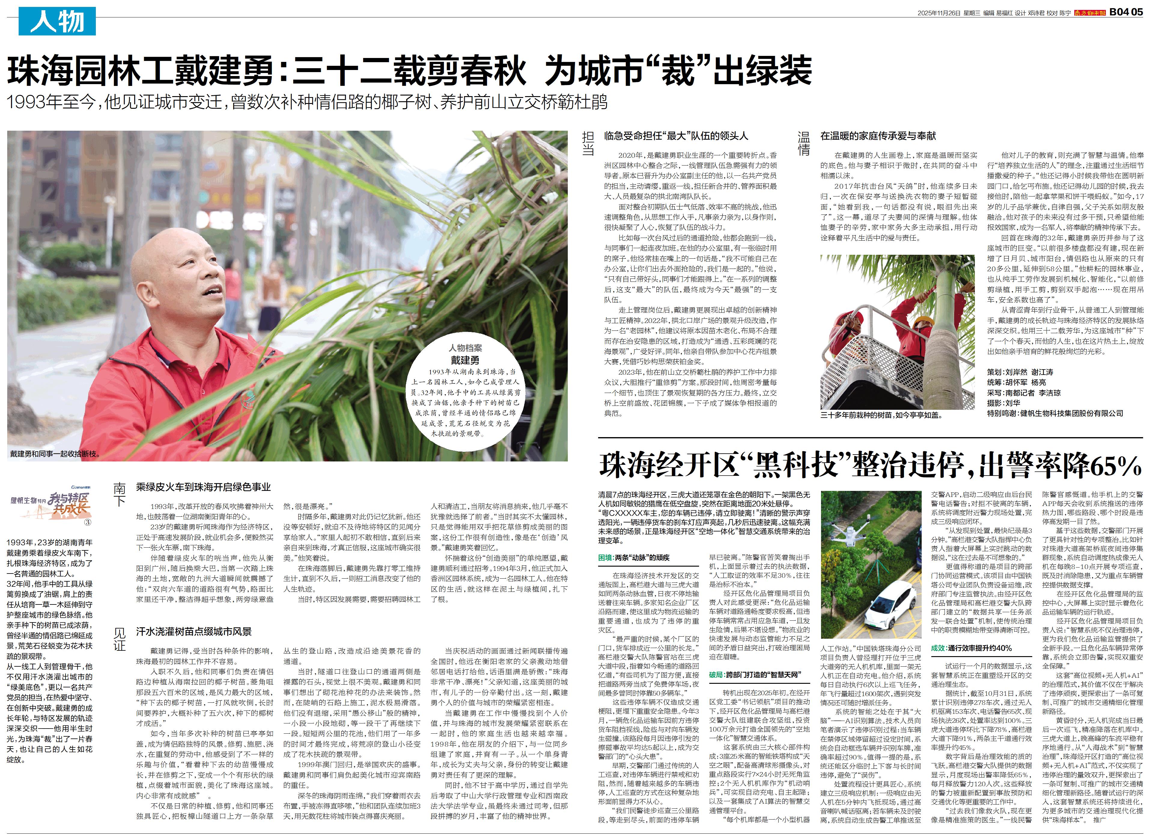 人物档案 戴建勇 1993年从湖南来到珠海,当上一名园林工人,如今已成管理人员。32年间,他手中的工具从绿篱剪换成了油锯,他亲手种下的树苗已成浓荫,曾经半通的情侣路已绵延成景,荒芜石径蜕变为花