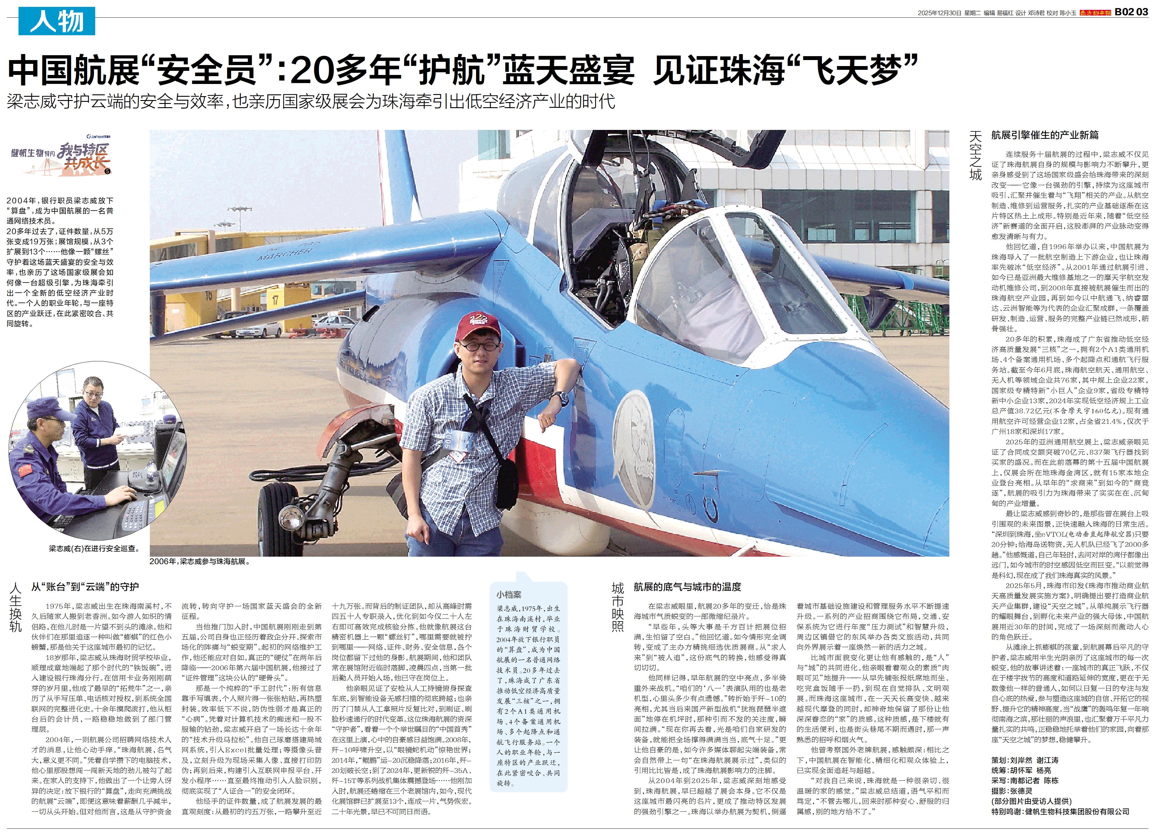 小档案 梁志威,1975年,出生在珠海南溪村,毕业于珠海财贸学校。2004年放下银行职员的“算盘”,成为中国航展的一名普通网络技术员。20多年过去了,珠海成了广东省推动低空经济高质量发展“三核”