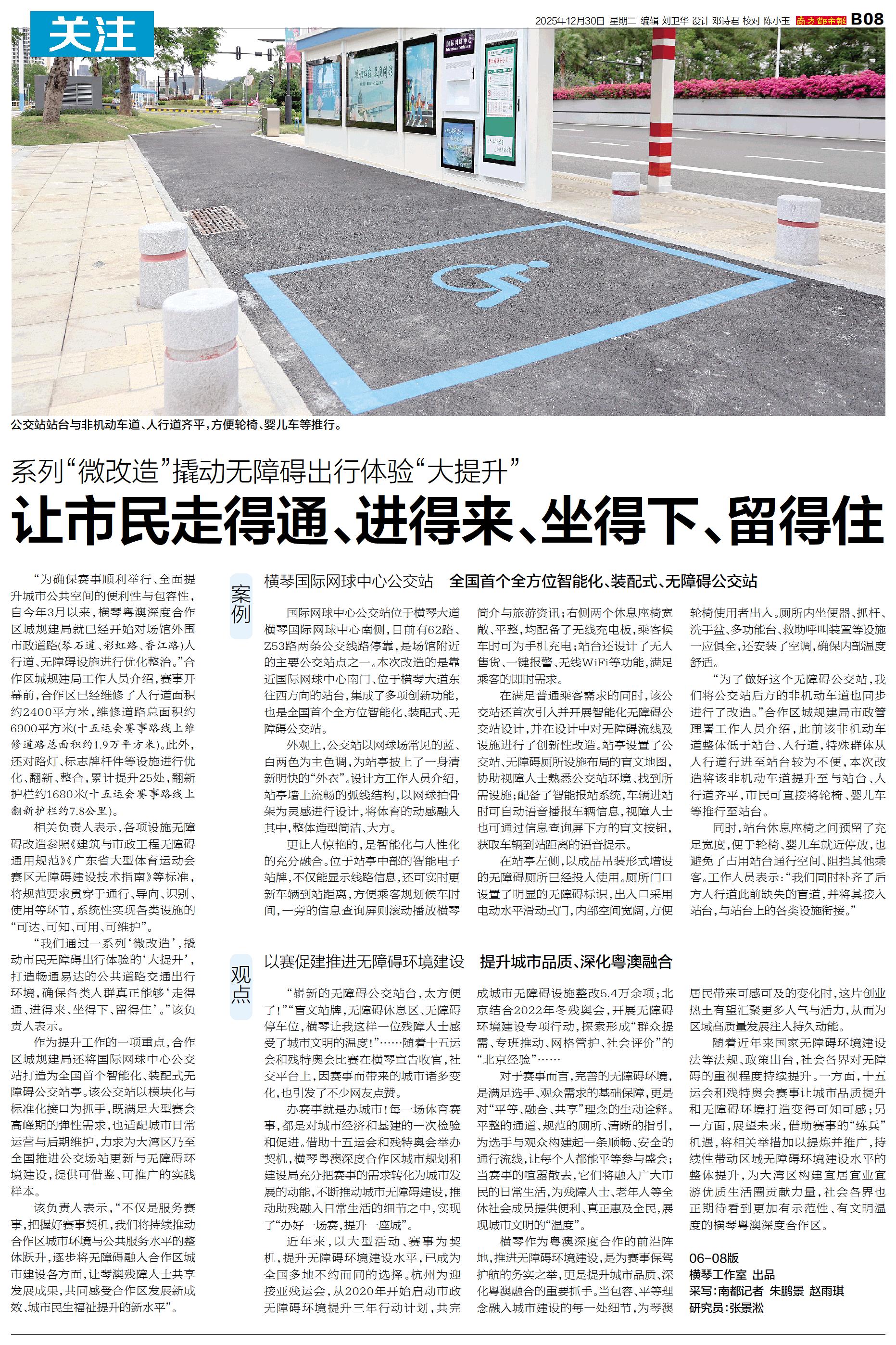 “为确保赛事顺利举行、全面提升城市公共空间的便利性与包容性,自今年3月以来,横琴粤澳深度合作区城规建局就已经开始对场馆外围市政道路(琴石道、彩虹路、香江路)人行道、无障碍设施进行优化整治。”合作区