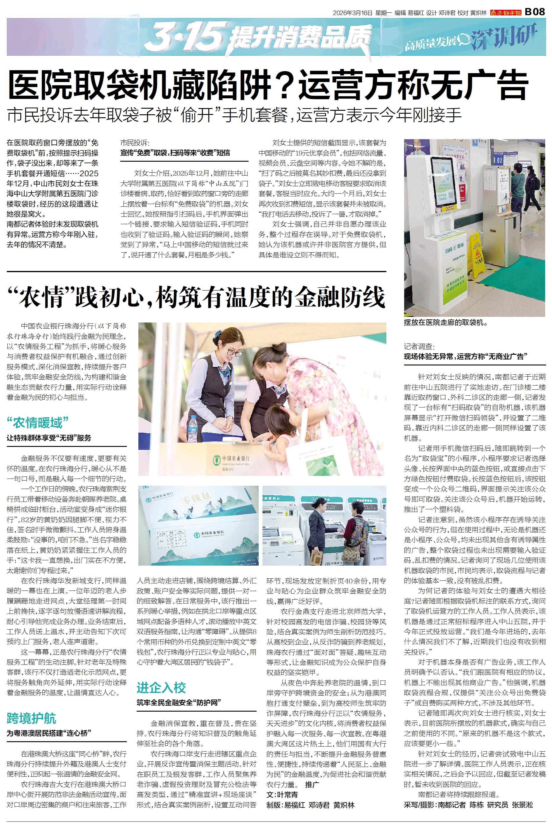 中国农业银行珠海分行(以下简称农行珠海分行)始终践行金融为民理念,以“农情服务工程”为抓手,将暖心服务与消费者权益保护有机融合,通过创新服务模式、深化消保宣教,持续提升客户体验,筑牢金融安全防线,
