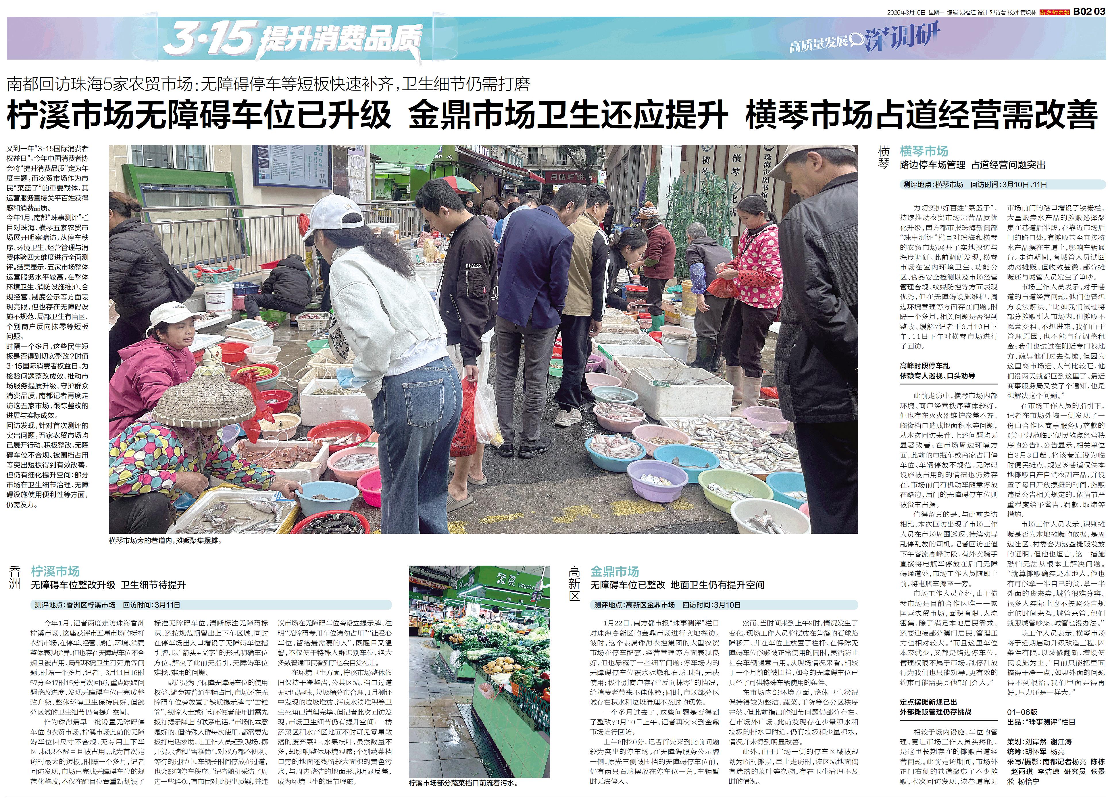 又到一年“3·15国际消费者权益日”。今年中国消费者协会将“提升消费品质”定为年度主题,而农贸市场作为市民“菜篮子”的重要载体,其运营服务直接关乎百姓获得感和消费品质。 今年1月,南都“珠事测评
