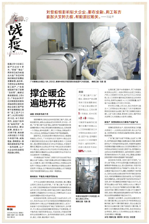 对受疫情影响较大企业,要在金融、用工等方面加大支持力度,帮助渡过难关。——习近平距离2月10日复工复产已过去十多天,“防疫”“稳企”两手抓已成为制造业大省广东应对特殊时期经济发展的重要举措。连日来,为