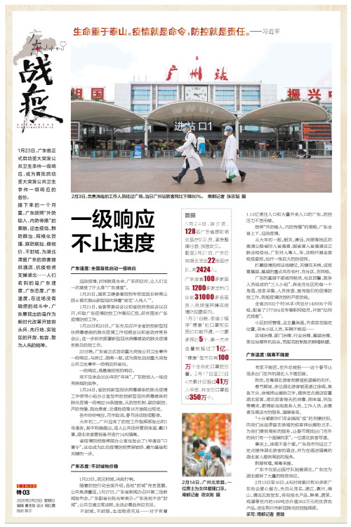 生命重于泰山。疫情就是命令,防控就是责任。——习近平1月23日,广东省正式启动重大突发公共卫生事件一级响应,成为首批启动重大突发公共卫生事件一级响应的省份。接下来的一个月里,广东按照“外防输入、内防传