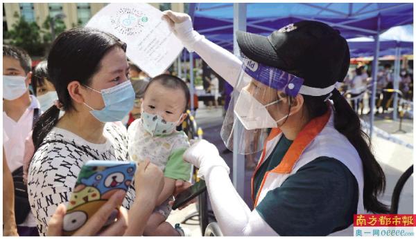 今年5月27日,广州市荔湾区城光荟采样点,志愿者一边为孩子遮阳一边给市民解答 疑问。 南都记者 冯宙锋 摄