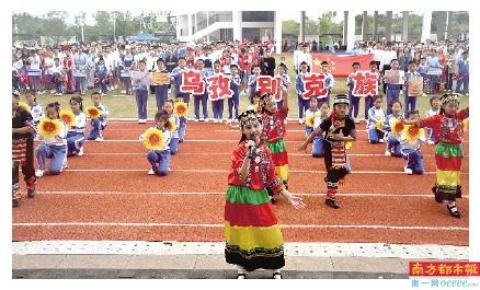 学校第四届“文化体育节”开幕式上,四(4)班同学正在表演。