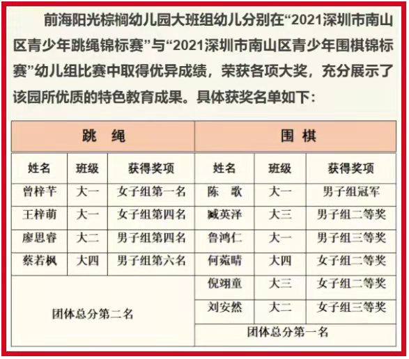 为了掌握儿童体能发展的基本情况,园所定期对幼儿进行体能测试,并采取有效的评价机制,让幼儿在快乐运动中健康成长。2021年,该园大班组的多名幼儿在南山区围棋及跳绳比赛中荣获幼儿组冠军、团体一等奖、个人一等奖、二等奖等多项荣誉,彰显了该园优质的特色教育成效。