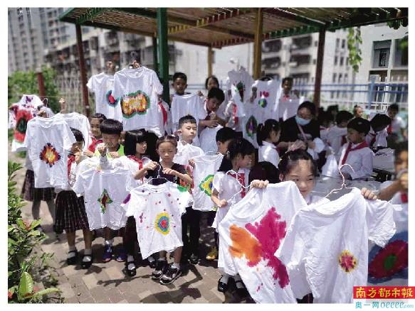 天台农场也是综合实践课程的主战场,环境课程的老师指导学生用天台农场植物的汁液调和成染料学习扎染,我们的祖先早就知道用劳动号子把劳动与音乐结合起来,教科院二附小每年的水稻收获节开始的时候也是在“击鼓开镰”礼环节开始的,用传统音乐让学生感受丰收的喜悦。