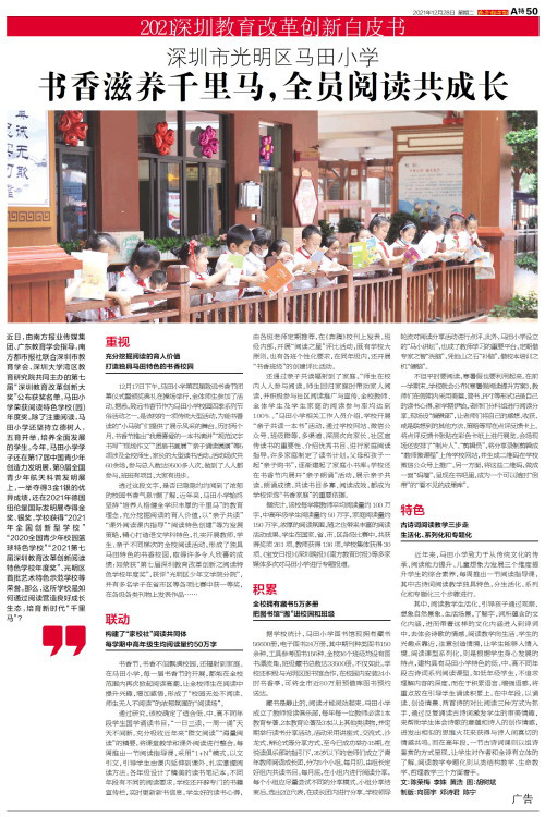 近日,由南方报业传媒集团、广东教育学会指导,南方都市报社联合深圳市教育学会、深圳大学湾区教育研究院共同主办的第七届“深圳教育改革创新大奖”公布获奖名单,马田小学荣获阅读特色学校(园)年度奖。除了注
