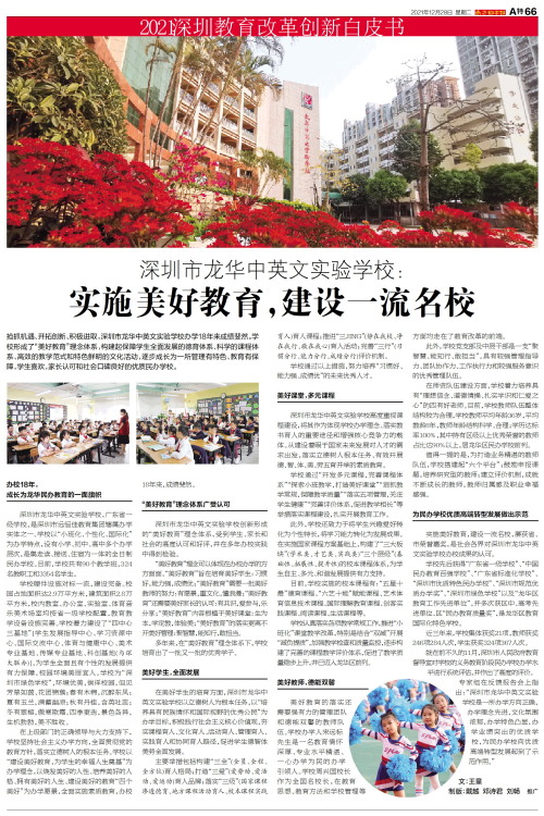 抢抓机遇、开拓创新、积极进取,深圳市龙华中英文实验学校办学18年来成绩斐然。学校形成了“美好教育”理念体系,构建起保障学生全面发展的德育体系、科学的课程体系、高效的教学范式和特色鲜明的文化活动,逐