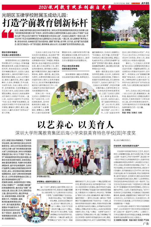 近日,由南方都市报社联合深圳市教育学会、深圳大学湾区教育研究院共同主办的第七届“深圳教育改革创新大奖”评选中,深圳市光明区玉律学校附属玉成幼儿园(以下简称“玉成幼儿园”)凭出众实力被评为“年度最受