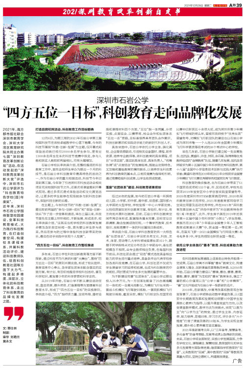 2021年,南方都市报社联合深圳市教育学会、深圳大学湾区教育研究院共同主办第七届“深圳教育改革创新论坛”活动。在活动发起的“深圳教育改革创新大奖”评选中,深圳市石岩公学获评为“科创教育特色学校(园