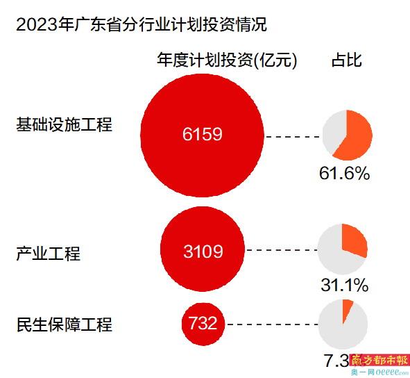 分行业计划投资看,根据广东省发改委数据,基础设施工程年度计划投资6159亿元,占比61.6%;产业工程年度计划投资3109亿元,占比31.1%;民生保障工程年度计划投资732亿元,占比7.3%。