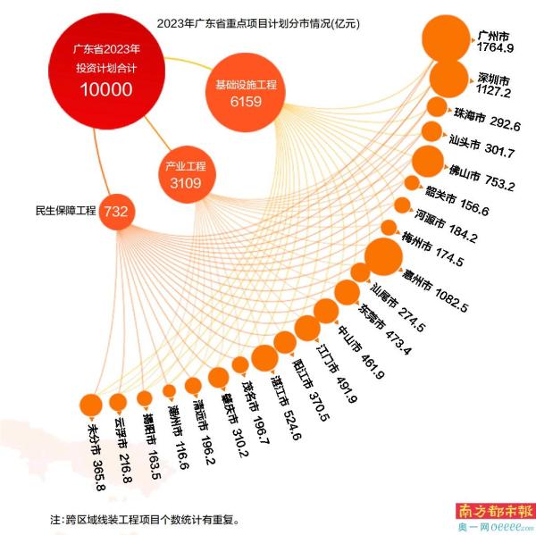 兔年伊始,广东重大项目蓝图已现。根据广东省发改委发布的2023年重点建设项目计划,全省将安排1530个重点项目,总投资约8.4万亿元,重点项目年度计划投资约1万亿元,比去年增加1000亿元。项目涵盖基础设施、产业和民生保障三大领域,各地年度投资计划在百亿元规模以上,广州、深圳、惠州投资计划更是超千亿元。