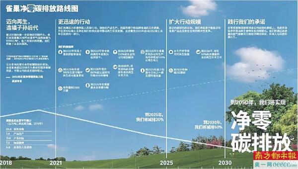 雀巢在2019年提出到2050年实现净零碳排放的承诺,并于2020年推出了涵盖具体行动路径和时间节点的路线图。根据雀巢净零碳排放路线图,以2018年全集团全价值链碳排放(共计9200万吨)为基线,在业务持续增长的同时,雀巢计划到2025年减排20%,到2030年减排50%。为实现2050年净零碳排放目标,雀巢在整个价值链中开展行动,以减少“从农场到餐桌”的产品碳排放。