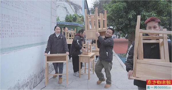 古茗工作人员和孩子们一起将新课桌搬进教室。