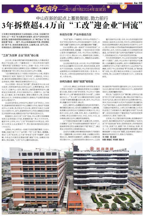 三年累计拆除整理低效工业用地超4.4万亩,为发展打开空间;以“一号文”形式推进科技强市,助力产业和科技互促双强;加强市级统筹促进镇域协作,从“单打独斗”向“组团发展”转变……眼下,中山正踩着奋进的