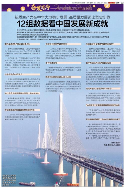 中央经济工作会议提出,我国经济基础稳、优势多、韧性强、潜能大,长期向好的支撑条件和基本趋势没有变。 在风雨洗礼中发展,在历经考验中壮大。即将过去的2024年,新质生产力在中华大地稳步发展,高质量