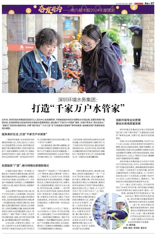 近年来,深圳环境水务集团切实践行以人民为中心的发展思想,不断精进城市供排水保障和水环境治理,显著改善用户服务体验。积极探索超大型城市供排水精细化管理新路径,通过推行“千家万户水管家”服务,为用户带
