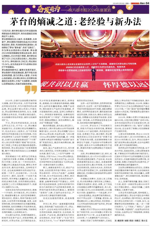 12月25日,贵州茅台酒2025年全国经销商联谊会在贵阳召开,来自全国省区经销商近千人参会。 茅台管理层在会上表示,在高基数、大体量下,茅台酒预计将顺利完成2024年初既定目标,营收、利润保持两