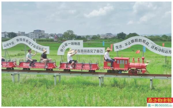 惠州惠城区横沥镇墨园村,游客在稻田小火车上感受乡野情趣。