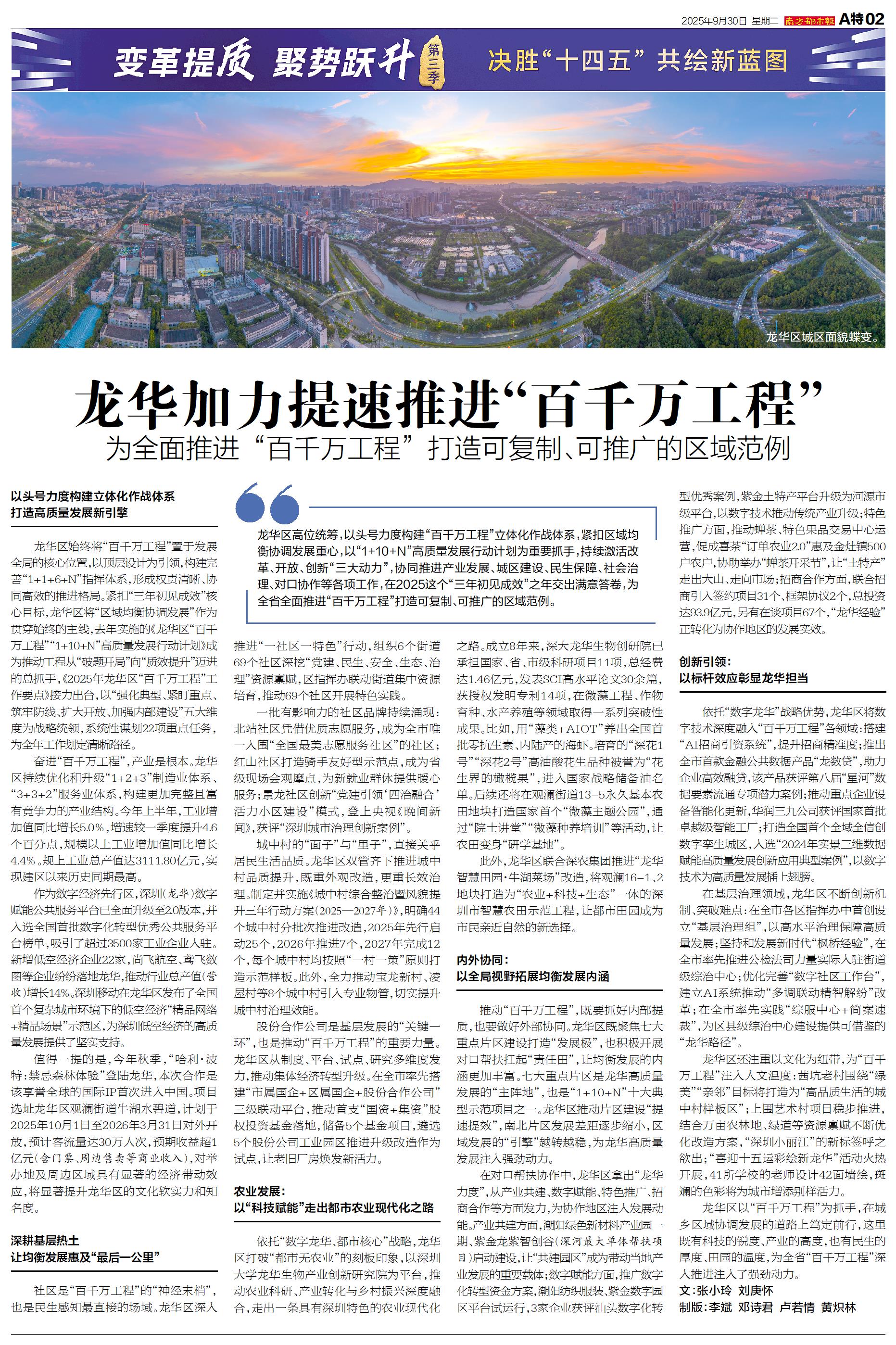 龙华区高位统筹,以头号力度构建“百千万工程”立体化作战体系,紧扣区域均衡协调发展重心,以“1+10+N”高质量发展行动计划为重要抓手,持续激活改革、开放、创新“三大动力”,协同推进产业发展、城区建