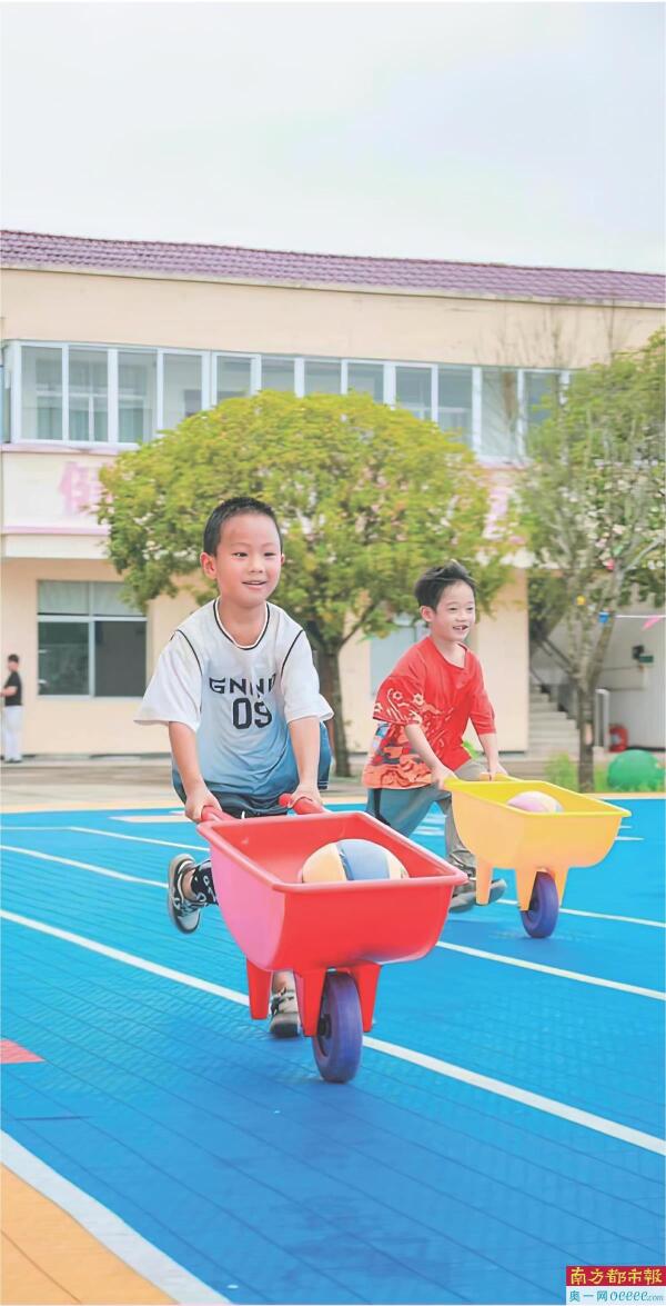 幼儿园园长阳双江介绍,学校是在2017年建设完毕的,承接周边街道的适龄学前儿童,是目前街道最大的幼儿园,小、中、大三个年级有80多位小朋友,配备师资10人,“学校的各项设施都是比较完善的,唯一美中不足的就是操场,当时只是用水泥浇盖了一块场地。”