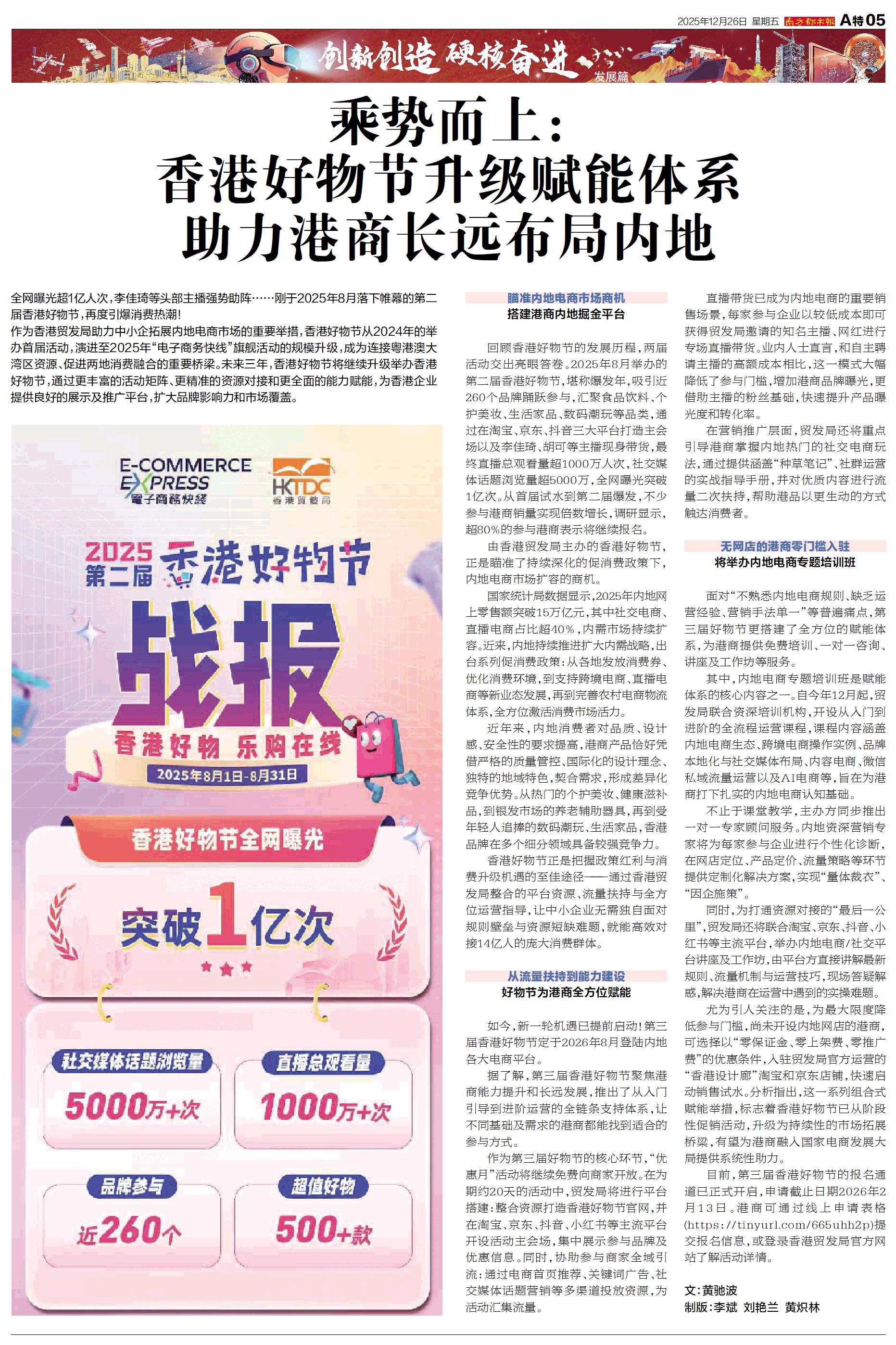 发展篇 全网曝光超1亿人次,李佳琦等头部主播强势助阵……刚于2025年8月落下帷幕的第二届香港好物节,再度引爆消费热潮! 作为香港贸发局助力中小企拓展内地电商市场的重要举措,香港好物节从202