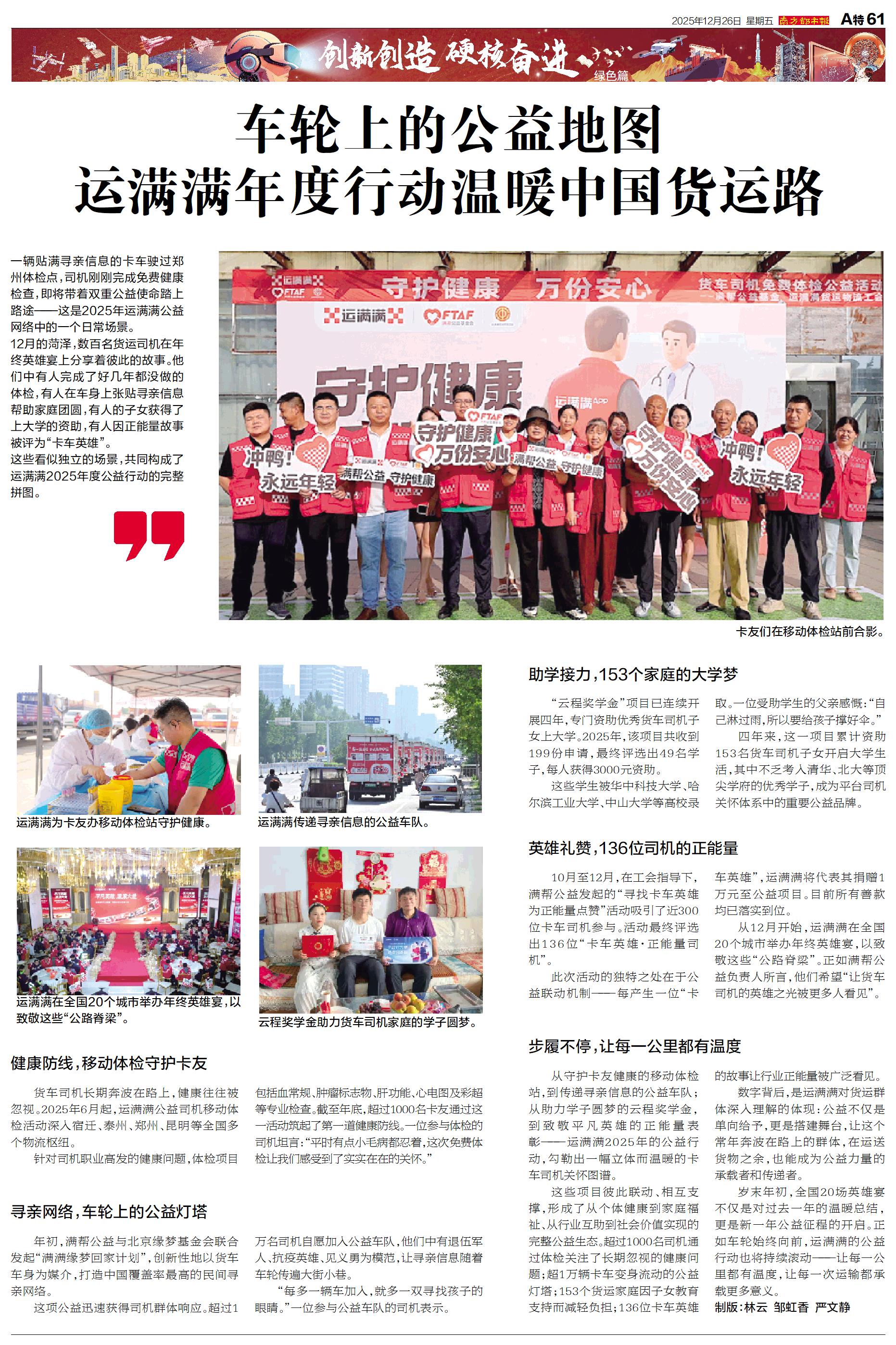 绿色篇 一辆贴满寻亲信息的卡车驶过郑州体检点,司机刚刚完成免费健康检查,即将带着双重公益使命踏上路途——这是2025年运满满公益网络中的一个日常场景。 12月的菏泽,数百名货运司机在年终英雄宴