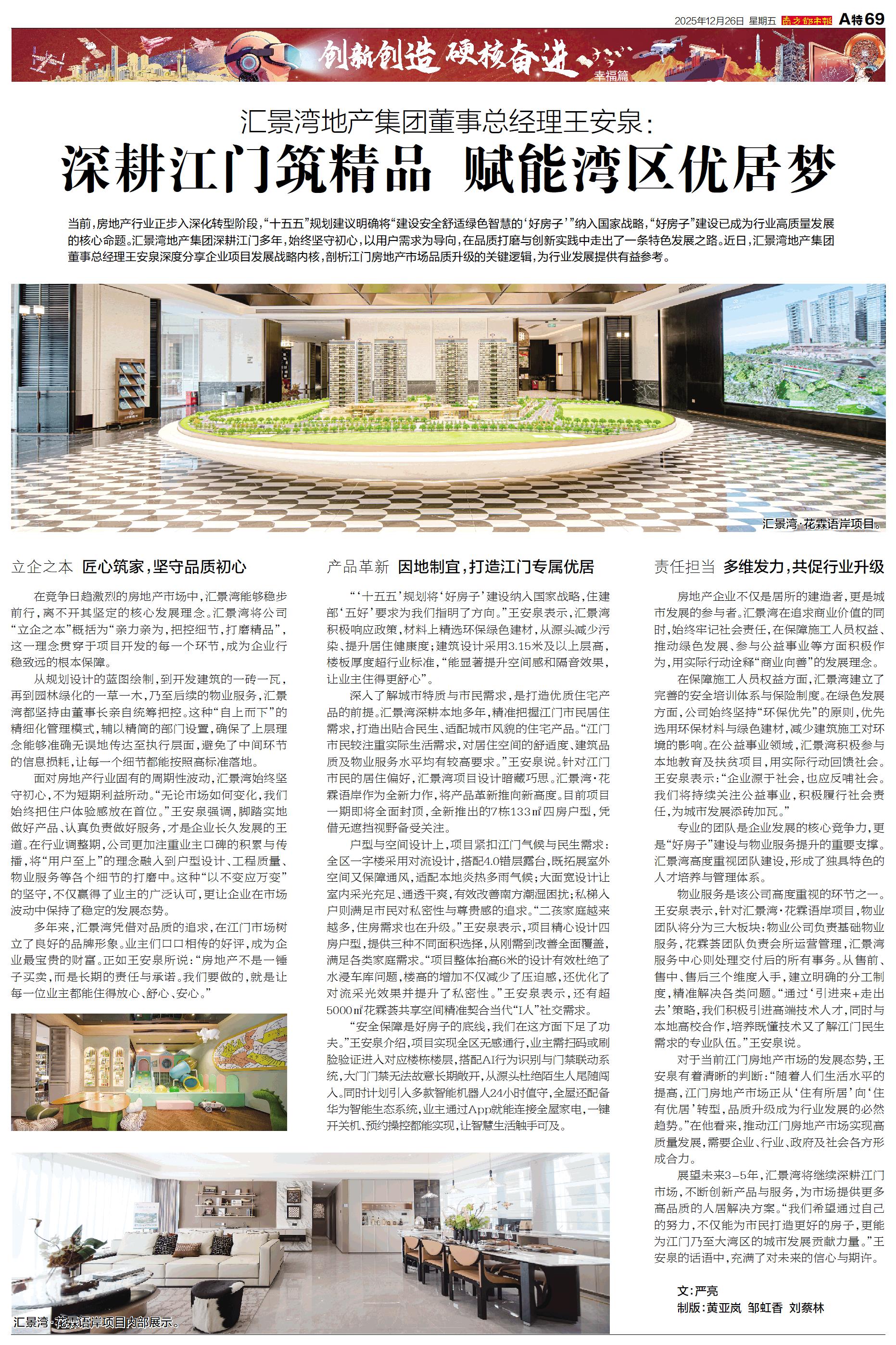 幸福篇 当前,房地产行业正步入深化转型阶段,“十五五”规划建议明确将“建设安全舒适绿色智慧的‘好房子’”纳入国家战略,“好房子”建设已成为行业高质量发展的核心命题。汇景湾地产集团深耕江门多年,始