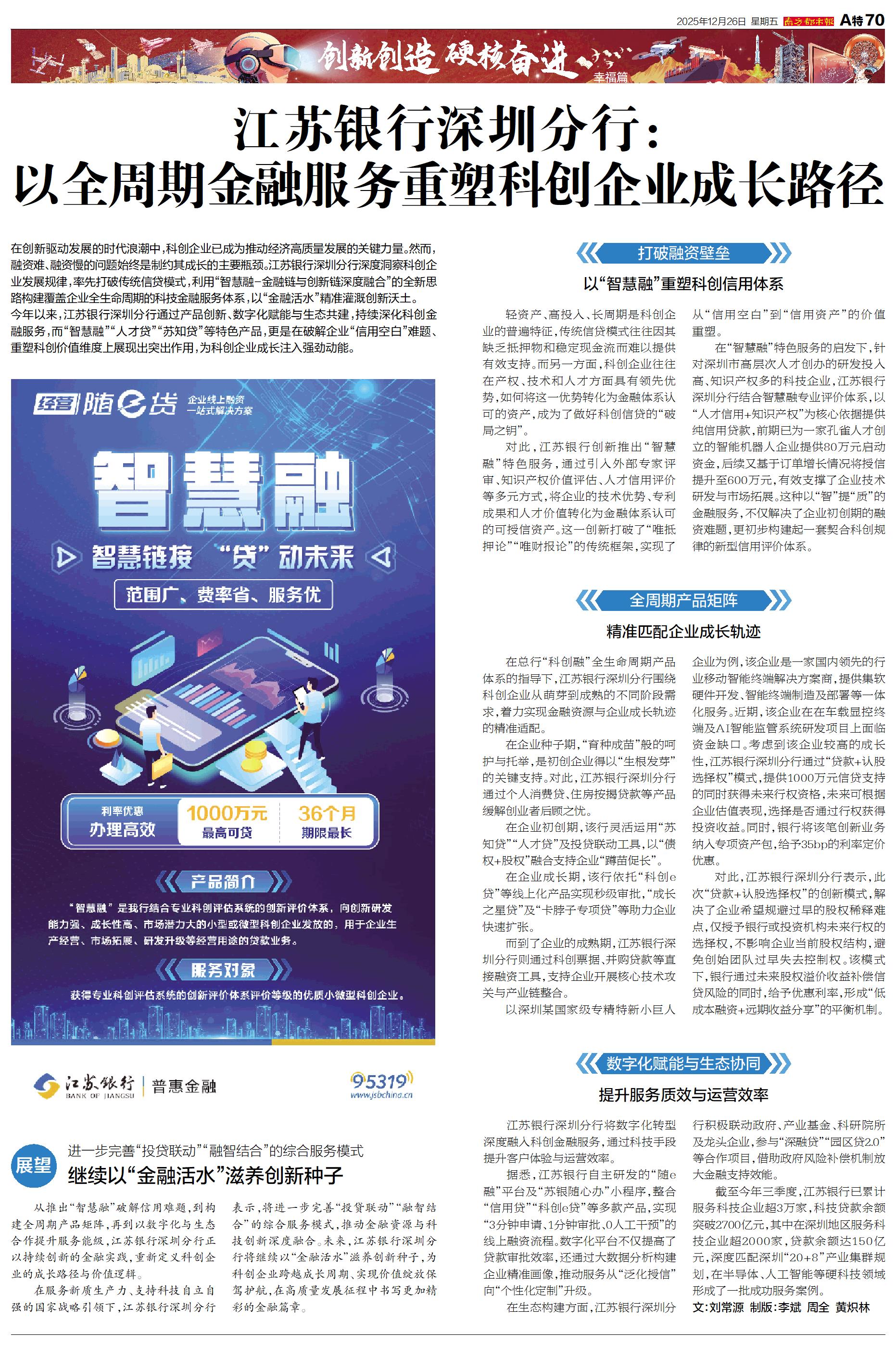 幸福篇 在创新驱动发展的时代浪潮中,科创企业已成为推动经济高质量发展的关键力量。然而,融资难、融资慢的问题始终是制约其成长的主要瓶颈。江苏银行深圳分行深度洞察科创企业发展规律,率先打破传统信贷模